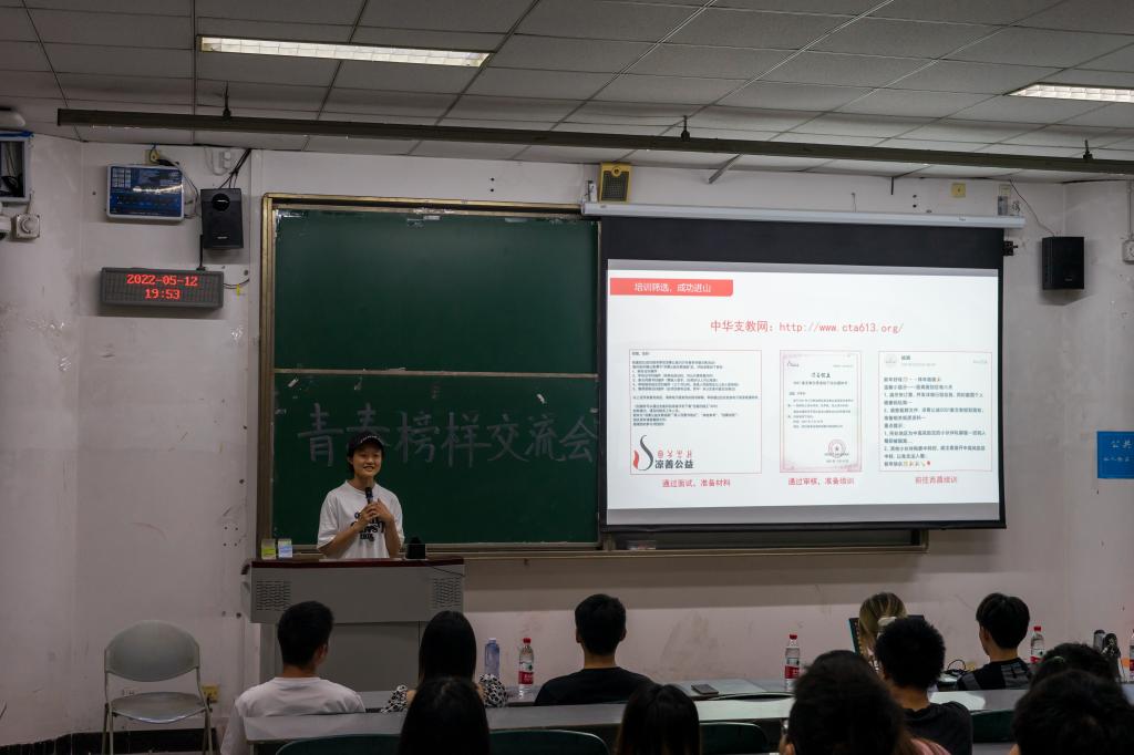志愿者之星郑煜分享了自己的休学一年专门前往山区支教的志愿者经历,为同学们介绍了支教报名的平台、流程。要有热情、吃苦耐劳的品质,同时提升个人素质,才能成为一名优秀志愿者。