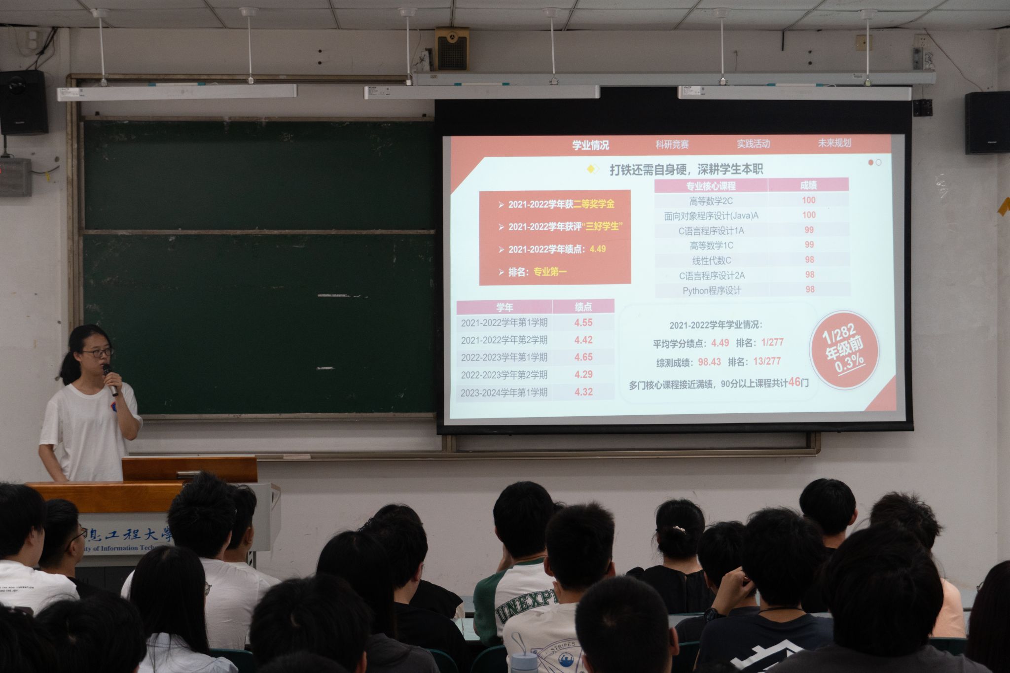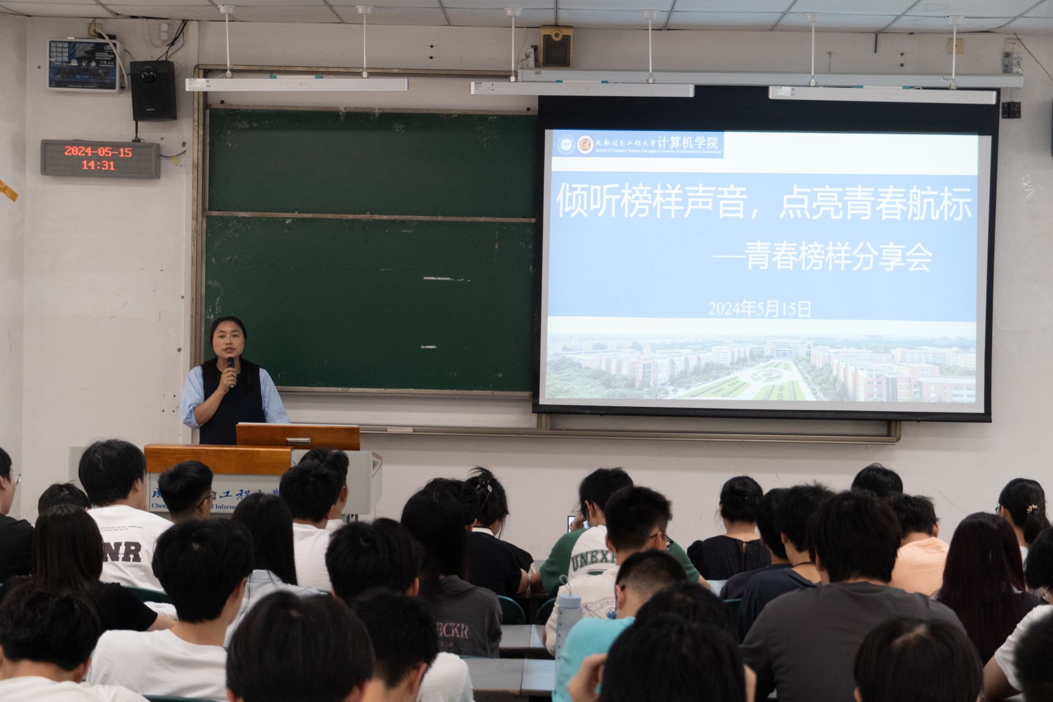 为了以优秀榜样的学习经验和成长故事,激发学生的学习动力和奋斗精神,帮助学生们更好规划自己的学业和成长道路。5月15日下午14:00,在航空港第四教学楼H4112教室,金沙集团1862cc开展了以“倾听榜样声音,点亮青春航标”为主题的青春榜样分享会。学院辅导员余弘丽,“双创之星”喻云、“学习之星”宋扬,2022级计算机科学与技术专业全体学生参加。