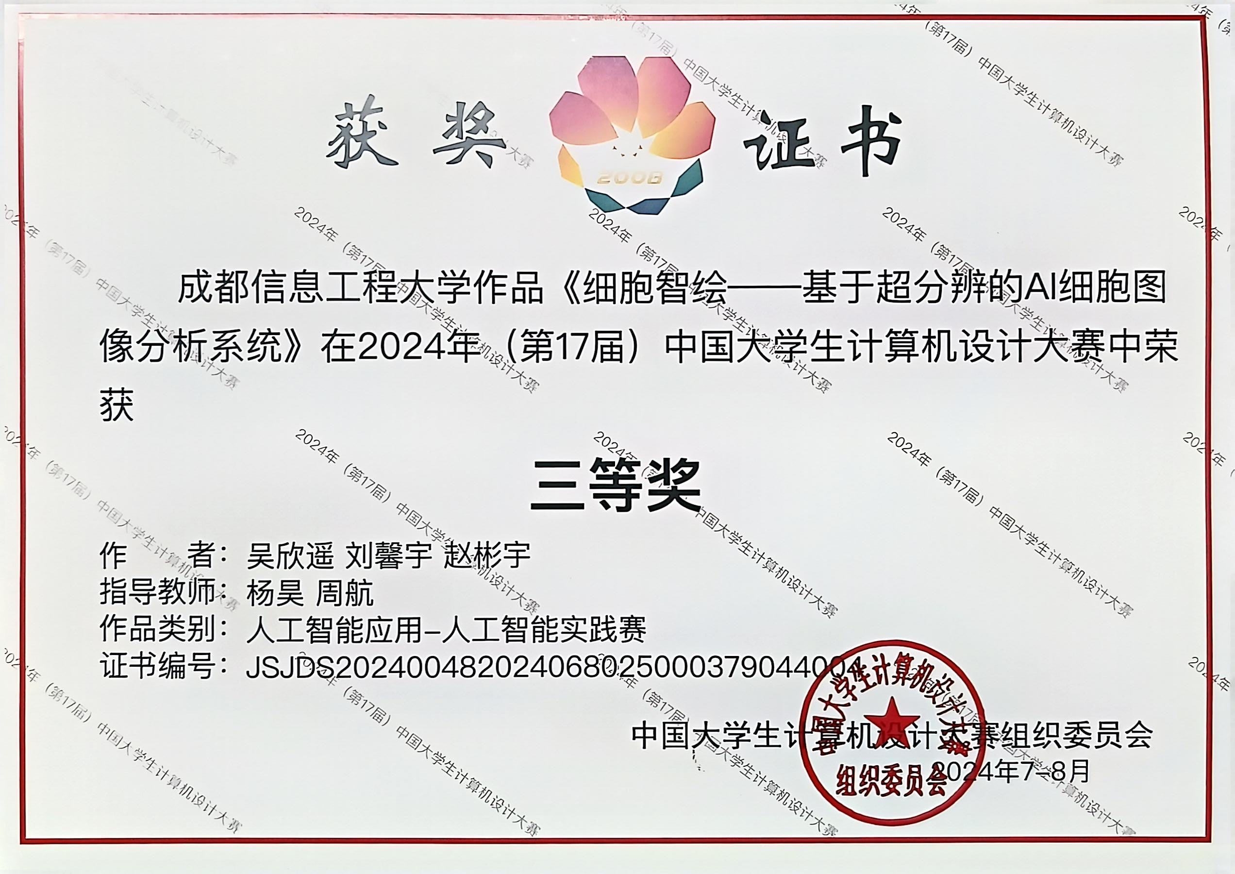 7月至8月,2024年(第17届)中国大学生计算机设计大赛决赛分别在上海、威海、沈阳、南京、厦门和金华等6个赛区举办。金沙官网教师杨昊、周航指导,2022级本科生吴欣遥、刘馨宇、赵彬宇同学完成的《细胞智绘—基于超分辨的AI细胞图像分析系统》作品,参加南京赛区“人工智能应用”大类决赛,荣获全国三等奖。