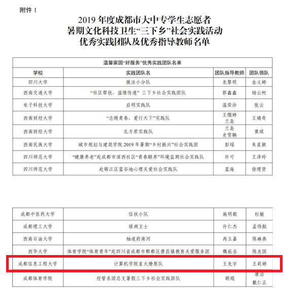 金沙官网高度重视“三下乡”社会实践活动,召开专题会议进行动员与部署,并与共青团金堂县委建立了合作关系。金沙官网两支队伍于七月先后前往金堂县淮口镇开展“三下乡”活动。其中金沙集团1862cc“星火燎原队”获得了2019年度成都市大中专学生志愿者暑期文化科技卫生“三下乡”社会实践活动温馨家园“好服务”优秀实践团队称号。