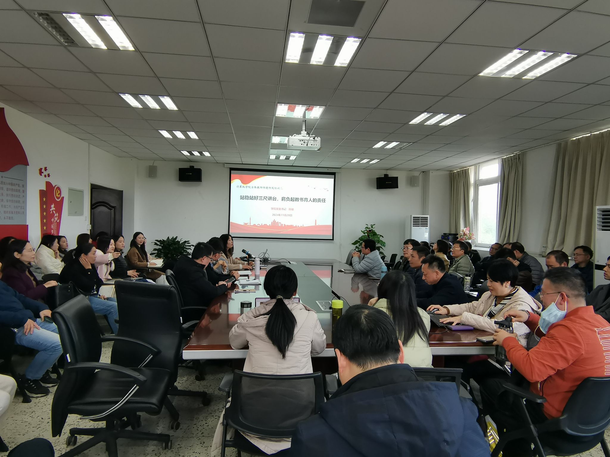 为增强全院教师“教书育人”意识,提高教师潜心教学的主动性,11月28日下午,学院组织开展以“站稳站好三尺讲台,肩负起教书育人的责任”为主题的专题培训学习活动。本次培训学习由党委书记陈敏主讲,学院全体教师参与培训。培训现场培训会上,陈敏首先带领老师们学习了习近平总书记在全国教育大会上讲话的主要内容,并鼓…[详细] 2024年11月29日